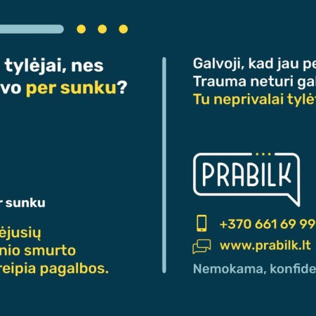Tyla palaiko smurtą, o kalbėjimas gali išgelbėti gyvybę! Jei patiri ar pastebi smurtą kreipkis pagalbos, pasikalbėk su artimu žmogumi ar specialistais.