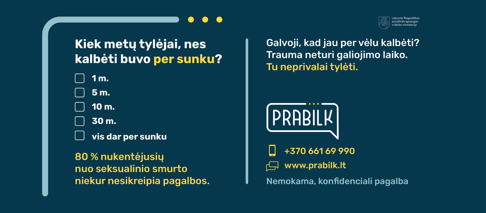 Dėl šios priežasties 2026 metais Nacionalinis informacijos apie seksualinį smurtą centras „Prabilk“ kartu su partneriais pradeda nacionalinę informacinę kampaniją: „Trauma neturi galiojimo laiko. Tu neprivalai tylėti – prabilk“. Šios kampanijos tikslas – ne tik atkreipti dėmesį į seksualinio pobūdžio nusikaltimus, bet ir mažinti stigmatizaciją, skatinti kreiptis pagalbos bei keisti vis dar gajus mitus.